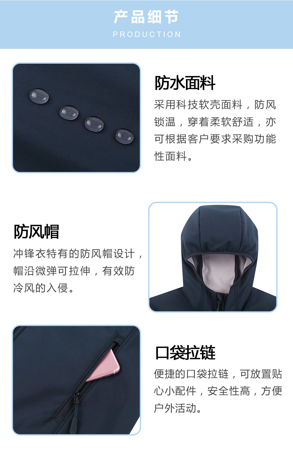 • 防水面料:采用科技軟殼面料,防風鎖溫,穿著柔軟舒適,亦可根據客戶要求軟殼沖鋒衣定制采購功能性面料。