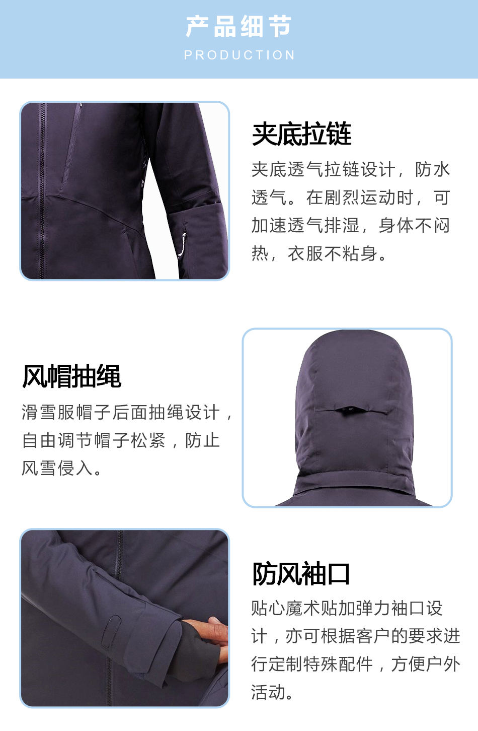 • 防風袖口:貼心魔術貼加彈力袖口設計,亦可根據客戶的要求進行定制特殊配件,方便戶外活動。